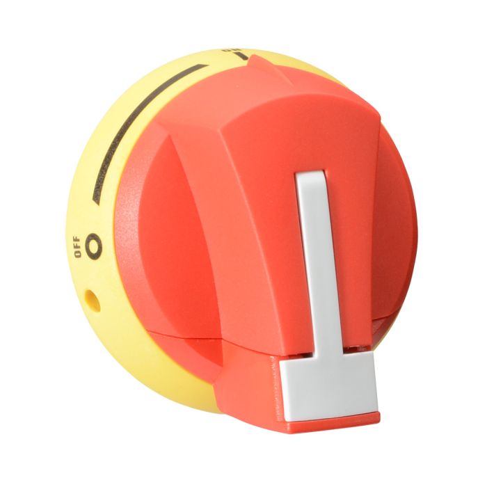 Socomec handle, round, S01 type, red/yellow, external front or right side mount, defeatable, lockable. For use with NEMA 4/4X enclosures.