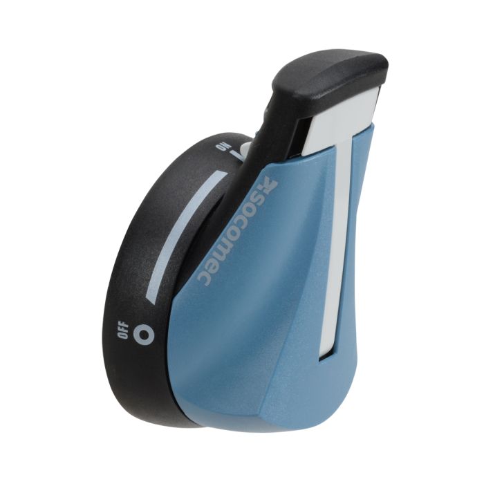 Socomec handle, pistol, S1 type, black/blue, external right side mount, defeatable, lockable. For use with NEMA 4/4X enclosures.