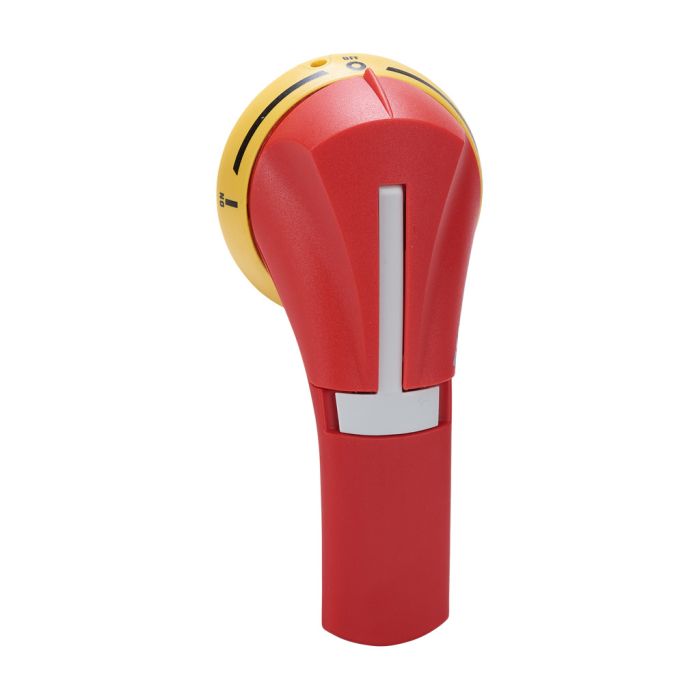 Socomec handle, pistol, S2 type, red/yellow, external front mount, 3-position, lockable in OFF only, defeatable. For use with SIRCOVER transfer bodies in NEMA 4/4X enclosures.
