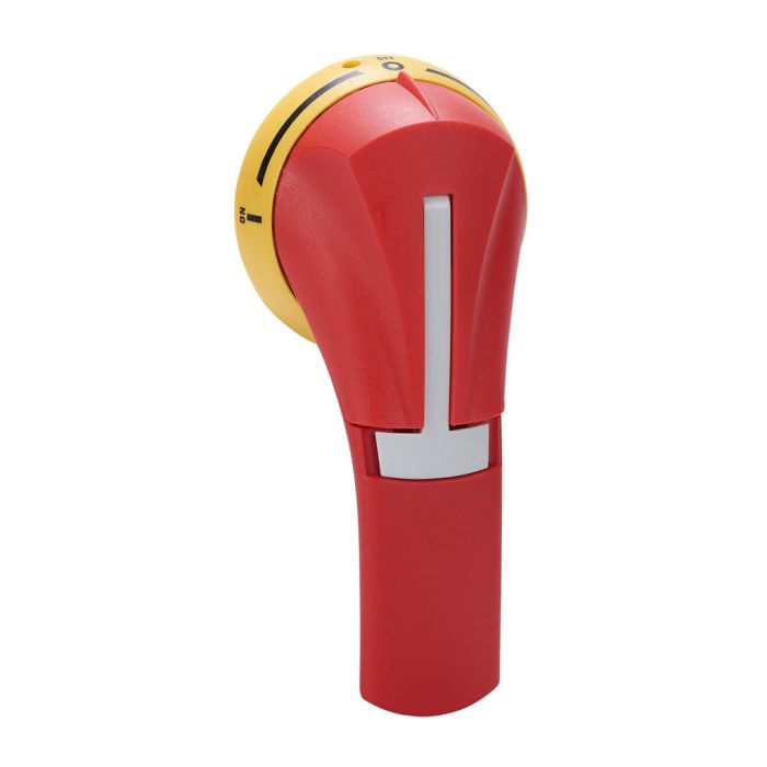 Socomec handle, pistol, S2 type, red/yellow, external front mount, 3-position, lockable in I-off-II, defeatable. For use with SIRCOVER transfer bodies in NEMA 1/3R/12 enclosures.