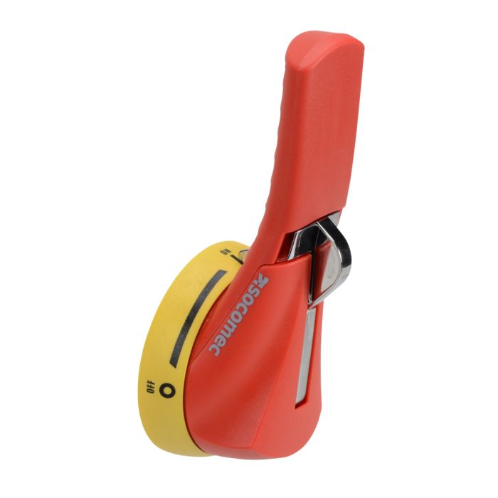 Socomec handle, pistol, heavy duty metallic hasp, S2 type, red/yellow, external right side mount, defeatable, lockable. For use with NEMA 4/4X enclosures.