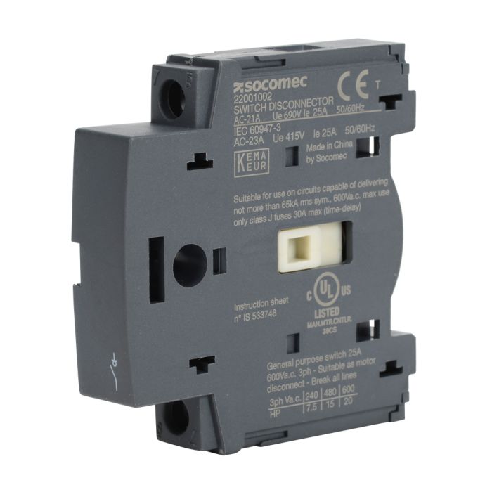 Socomec fourth pole module, 600 VAC, 25A, load break capable, 65kA SCCR, UL 508 rated. For use with SIRCO M 25A switch bodies.