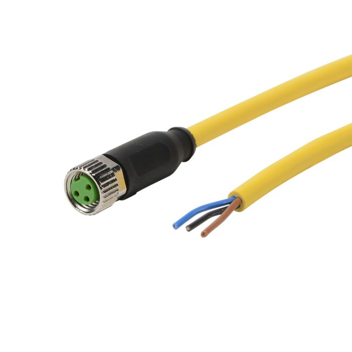 Cordset cable, M8 axial female to pigtail, 3-pole, PUR/PVC jacket, yellow, 22.9ft/7m cable length, IP65 IP66K IP67.