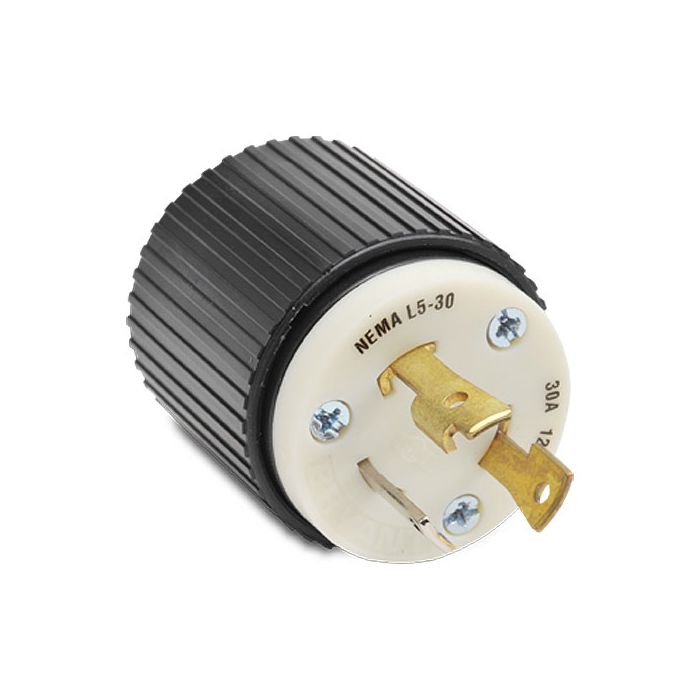 Locking plug, 30A, 125VAC, 2-pole, 3-wire, NEMA L5-30, cord clamp, black/white nylon housing, terminal cover, assembly screws, dust seal.