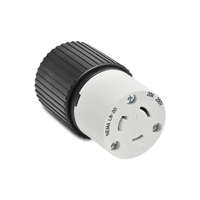 Locking connector, 20A, 250VAC, 2-pole, 3-wire, NEMA L6-20, cord clamp, black/white nylon housing, terminal cover, assembly screws, dust seal.