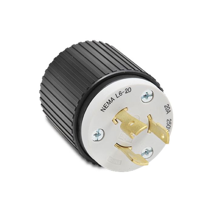 Locking plug, 20A, 250VAC, 2-pole, 3-wire, NEMA L6-20, cord clamp, black/white nylon housing, terminal cover, assembly screws, dust seal.