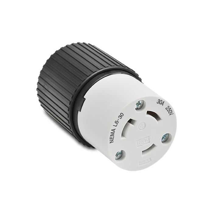 Locking connector, 30A, 250VAC, 2-pole, 3-wire, NEMA L6-30, cord clamp, black/white nylon housing, terminal cover, assembly screws, dust seal.