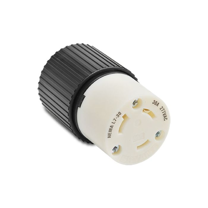 Locking connector, 30A, 277VAC, 2-pole, 3-wire, NEMA L7-30, cord clamp, black/white nylon housing, terminal cover, assembly screws, dust seal.