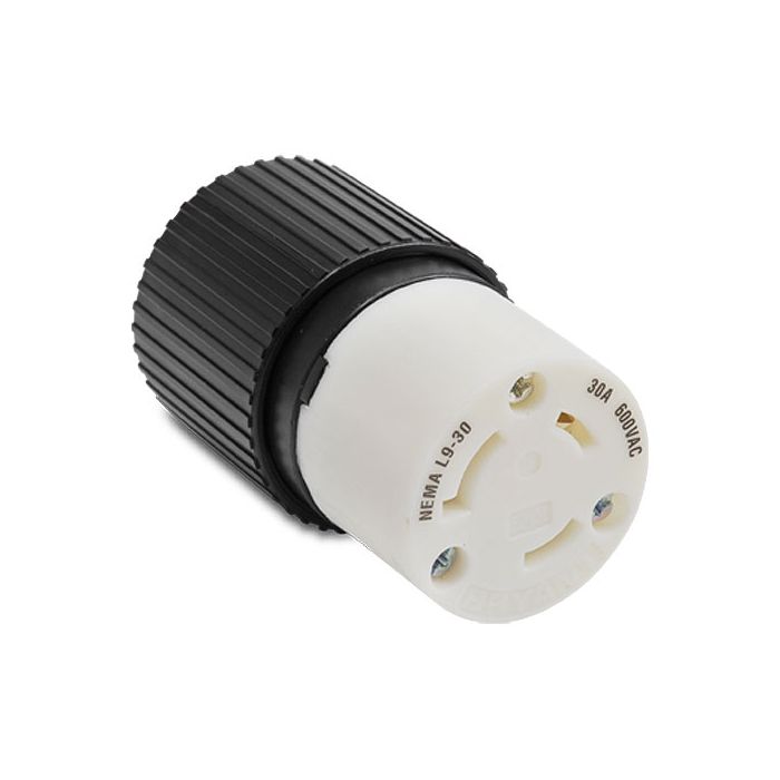 Locking connector, 30A, 600VAC, 2-pole, 3-wire, NEMA L9-30, cord clamp, black/white nylon housing, terminal cover, assembly screws, dust seal.