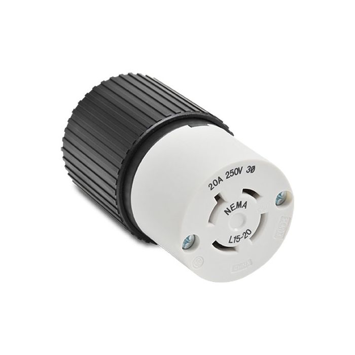 Locking connector, 20A, 250VAC, 3-pole, 4-wire, NEMA L15-20, cord clamp, black/white nylon housing, terminal cover, assembly screws, dust seal.