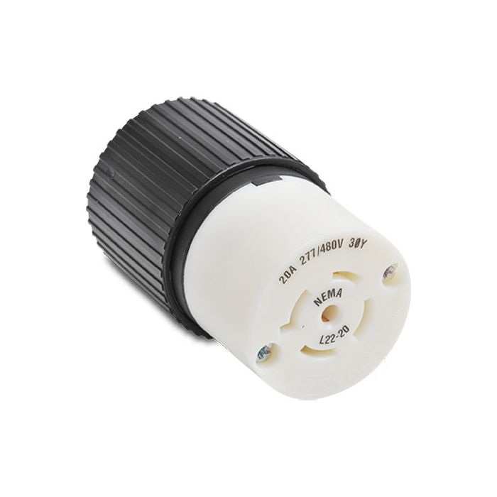 Locking connector, 20A, 277/480 VAC, 4-pole, 5-wire, NEMA L22-20, cord clamp, black/white nylon housing, terminal cover, assembly screws, dust seal.