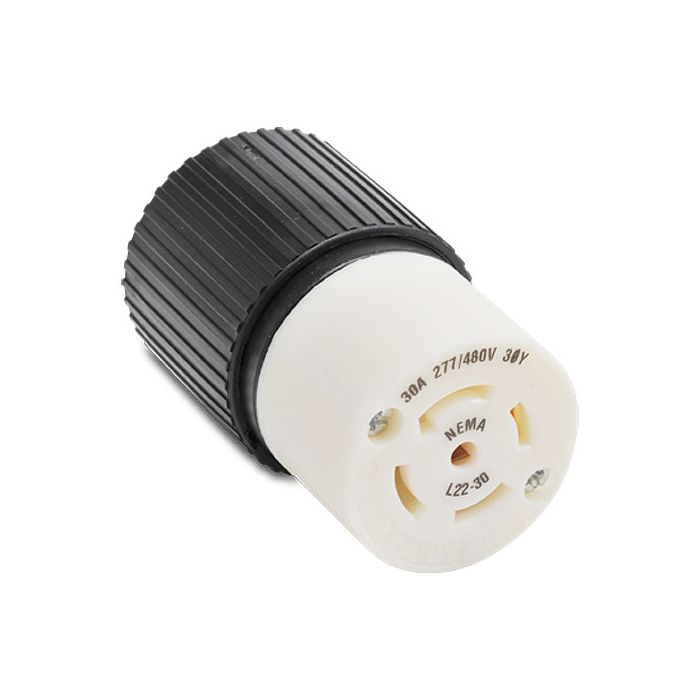 Locking connector, 30A, 277/480V, 4-pole, 5-wire, NEMA L22-30, cord clamp, black/white nylon housing, terminal cover, assembly screws, dust seal.