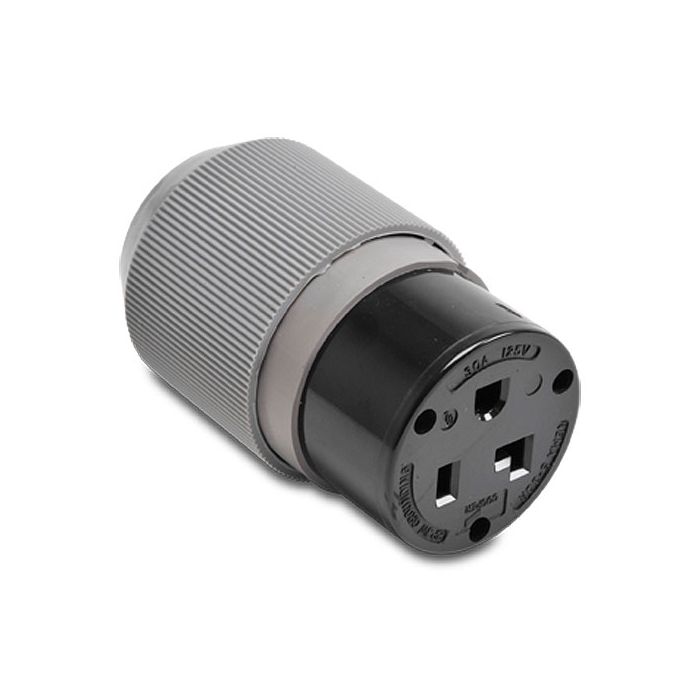 Straight blade connector, 30A, 125VAC, 2-pole, 3-wire, NEMA 5-30, cord clamp, thermoplastic housing, terminal cover, assembly screws, dust seal, gray housing.