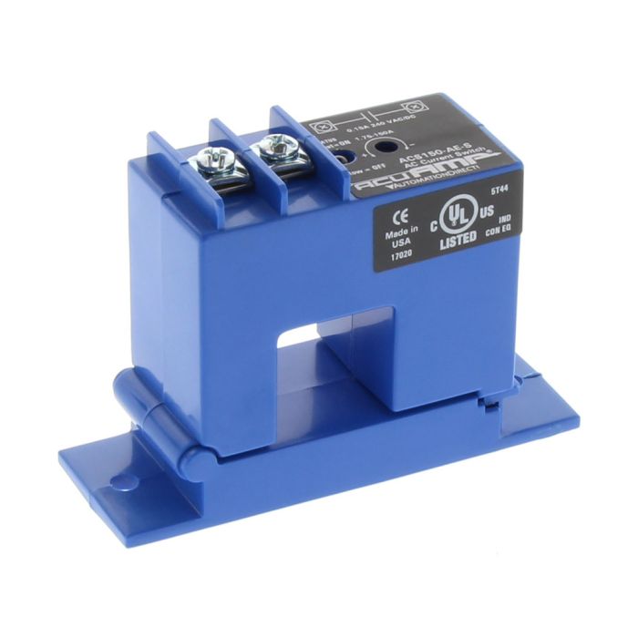 AcuAMP single-phase AC adjustable current switch, split core, 1.75-150A trip range, N.O., 0.15A @ 240 VAC/DC output, LED indication.