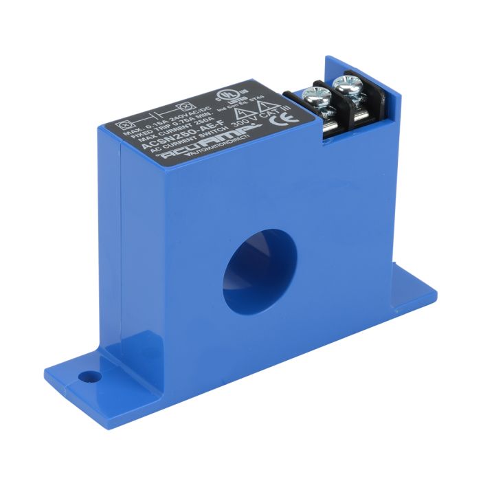 AcuAMP single-phase AC non-adjustable current switch, fixed core, fixed 0.75A trip point, N.O., 0.15A @ 240 VAC/DC output.