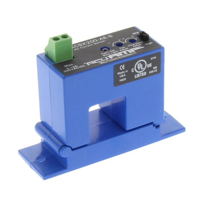 AcuAMP single-phase AC adjustable current switch, split core, 2-12, 12-55, or 55-200A trip ranges, N.O. 0.15A @ 240 VAC/DC time adjustable output.