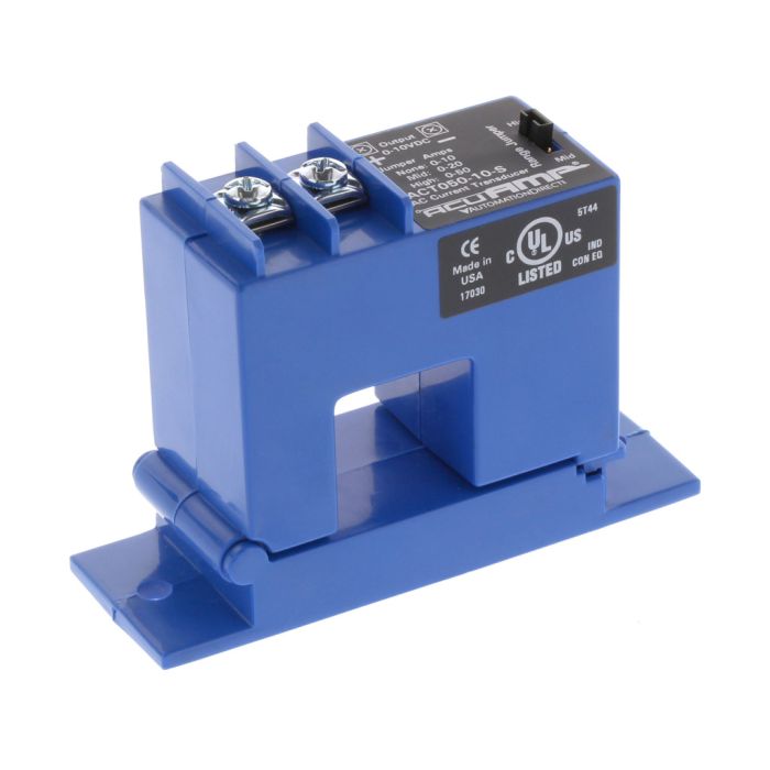 AcuAMP single-phase AC current transducer, split core, 0-10, 0-20, or 0-50A jumper-selectable input ranges, 0-10 VDC output.