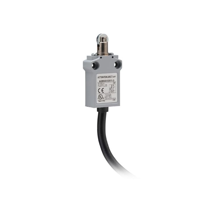Limit switch, metal plunger with metal roller, 1 N.O. and 1 N.C. contact with slow action break before make, 35mm wide metal, IP67, 3-meter cable exit.