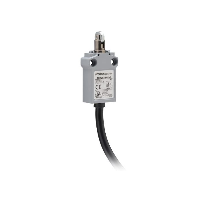 Limit switch, metal plunger with metal cross roller, 1 N.O. and 1 N.C. contact with slow action break before make, 35mm wide metal, IP67, 3-meter cable exit.