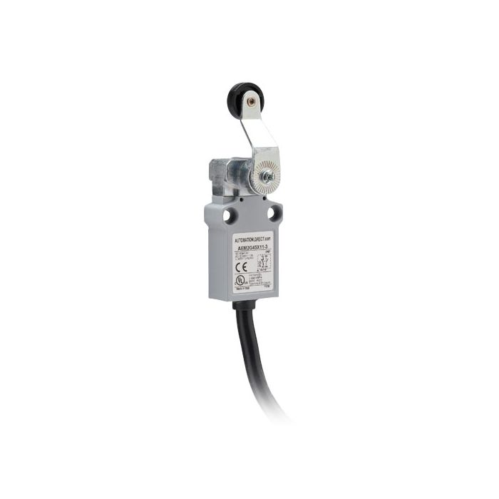 Limit switch, lever with 18mm nylon roller, 1 N.O. and 1 N.C. contact with slow action break before make, 35mm wide metal, IP67, 3-meter cable exit.