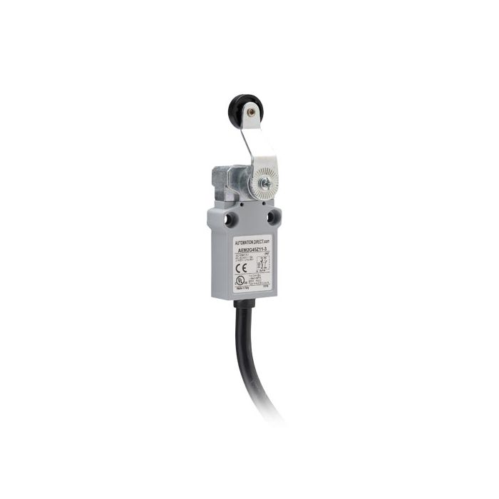Limit switch, lever with 18mm nylon roller, 1 N.O. and 1 N.C. contact with snap action, 35mm wide metal, IP67, 3-meter cable exit.