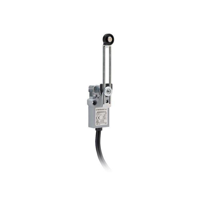 Limit switch, adjustable lever with 18mm nylon roller, 1 N.O. and 1 N.C. contact with slow action break before make, 35mm wide metal, IP67, 3-meter cable exit.