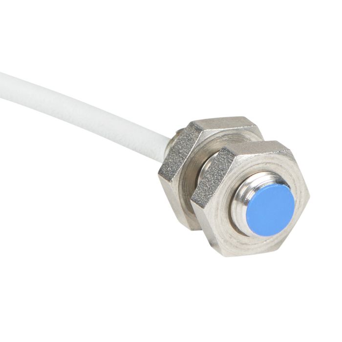 Inductive proximity sensor, 8 mm diameter, 20.3 mm body length, tubular, NPN, 2 mm nominal sensing distance, shielded, N.O. output, pigtail, 6.5 ft/2m cable length, stainless steel housing.
