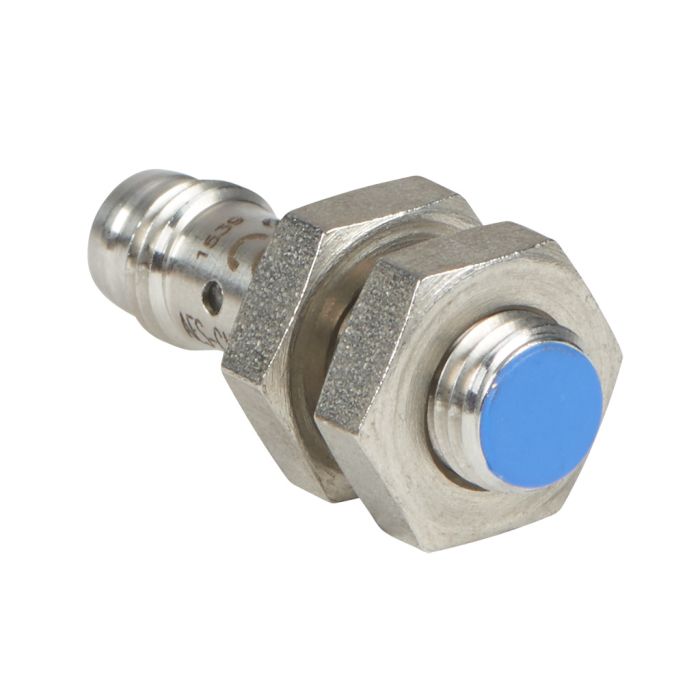 Inductive proximity sensor, 8 mm diameter, 29.4 mm body length, tubular, NPN, 1.5 mm nominal sensing distance, shielded, N.C. output, 3-pin M8 quick-disconnect, stainless steel housing.