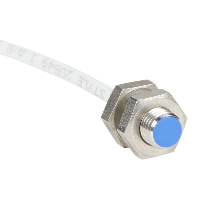 Inductive proximity sensor, 8 mm diameter, 20.3 mm body length, tubular, NPN, 2 mm nominal sensing distance, shielded, N.C. output, pigtail, 6.5 ft/2m cable length, stainless steel housing.
