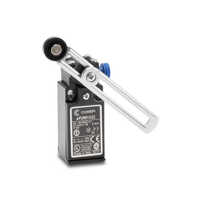 Comepi safety limit switch, adjustable lever, nylon roller actuator, 2 N.C. contact(s), slow action, plastic head, plastic body, 30 mm wide, 1/2 inch female NPT conduit entry(s).