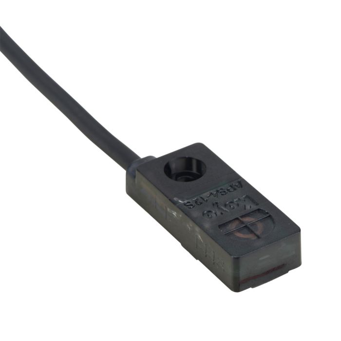 Koyo inductive proximity sensor, rectangular, 12 x 27 x 7 mm, NPN, 4 mm nominal sensing distance, unshielded, N.C. output, pigtail, 6.5 ft/2m cable length, polycarbonate housing.