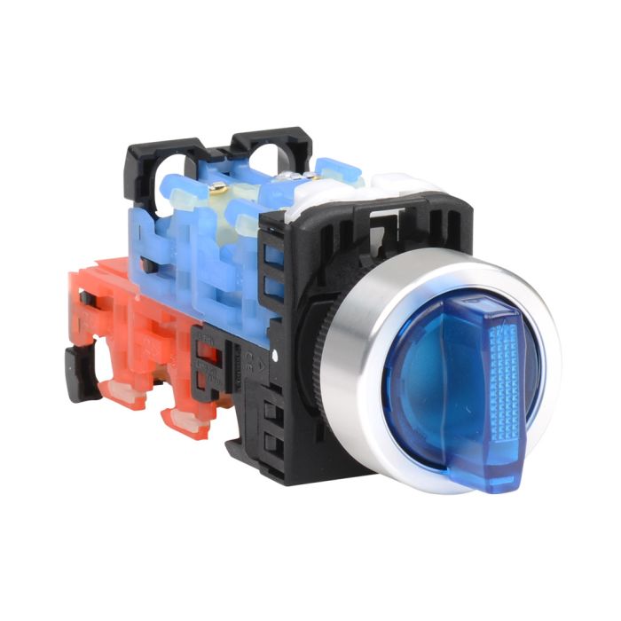 Fuji Electric selector switch, 22 mm, 3-position, maintained, LED illuminated, 2 N.C./2 N.O. contact(s), Operator: blue, knob, 30 mm, round, plastic, 24 VAC/DC, full voltage.