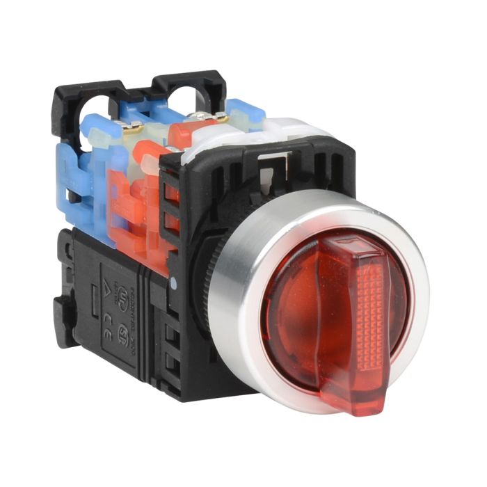 Fuji Electric selector switch, 22 mm, 3-position, spring return to center from left, maintained right, LED illuminated, 1 N.O./1 N.C. contact(s), metal bezel, Operator: red, knob, 30 mm, round, plastic, 115-127 VAC, transformer.