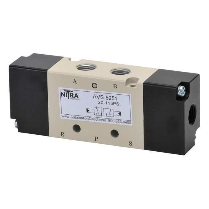 NITRA pilot valve 5-port (4-way) 2-position, double air pilot, (1) 1/8in FNPT inlet(s), (2) 1/8in FNPT outlet(s), (2) 1/8in FNPT exhaust(s), Cv=0.78.