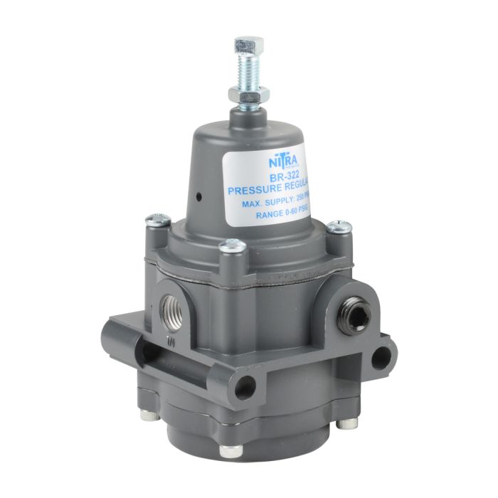 NITRA pneumatic regulator, 1/4in female NPT inlet(s), 1/4in female NPT outlet(s), 0-60 psi adjustable range.