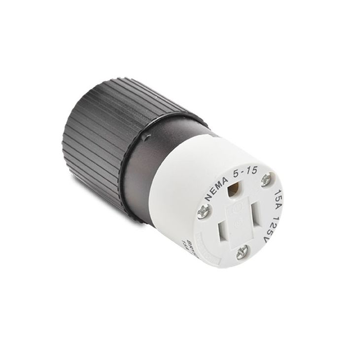 Straight blade connector, 15A, 125VAC, 2-pole, 3-wire, NEMA 5-15, cord clamp, black/white nylon housing, terminal cover, assembly screws, dust seal.