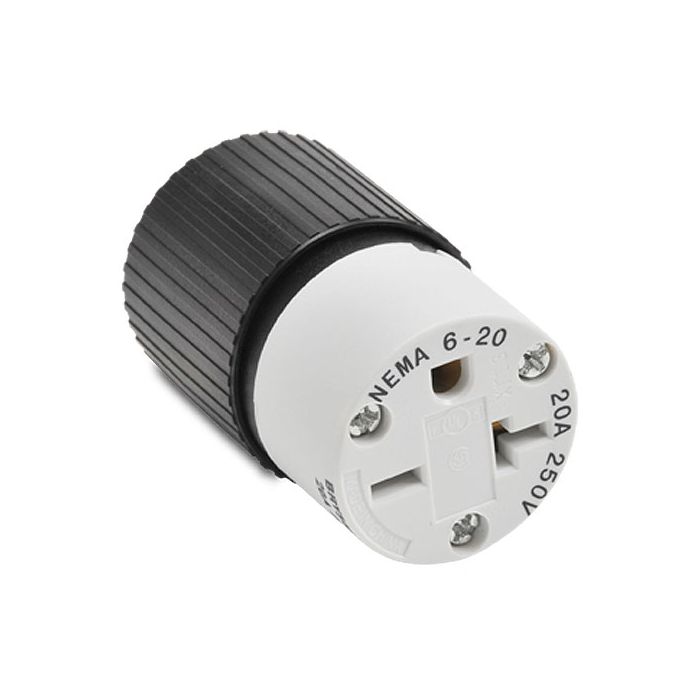 Straight blade connector, 20A, 250VAC, 2-pole, 3-wire, NEMA 6-20, cord clamp, black/white nylon housing, terminal cover, assembly screws, dust seal.
