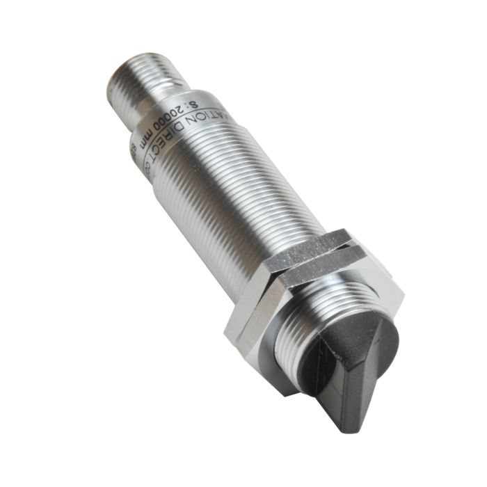 Photoelectric sensor, tubular, 18 mm, IP67, metal housing, through-beam emitter, right-angle lens, 3-wire, 6m sensing distance, visible red light emission, 4-pin M12 quick-disconnect.