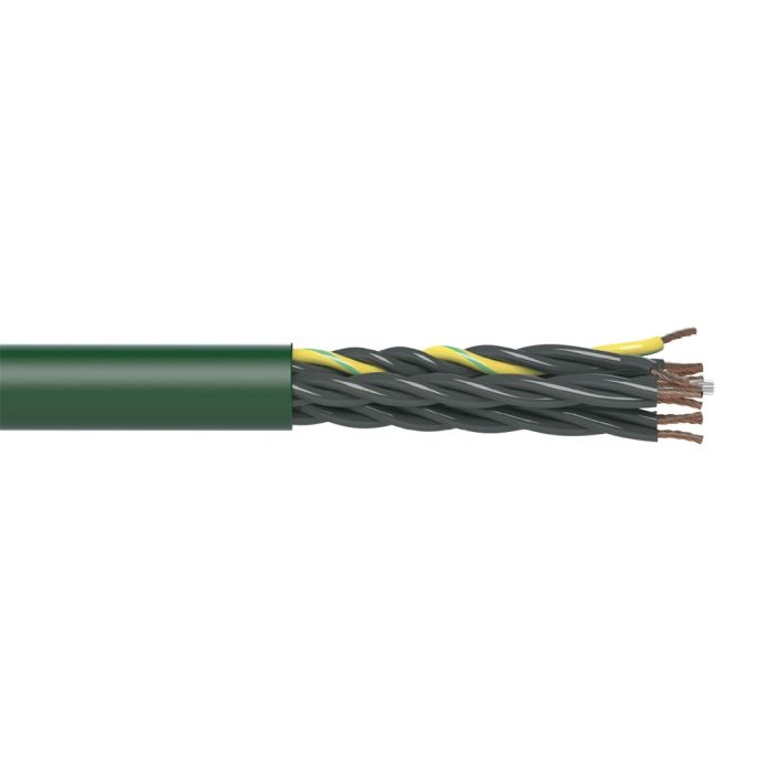 igus continuous flexing multi-conductor control cable, 12 conductors (includes ground), 0.75mm2 (18 AWG), PVC conductor insulation material, unshielded, PVC jacket, green, 250ft reel.