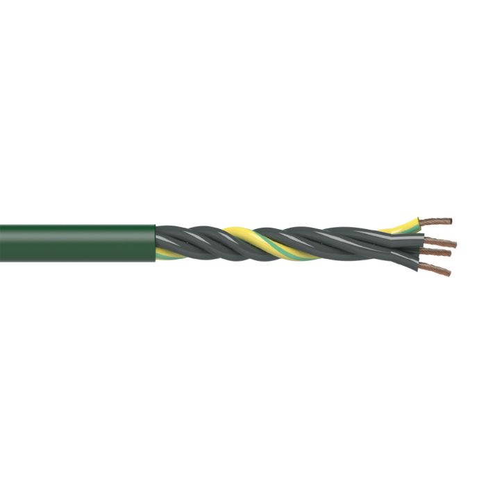 igus continuous flexing multi-conductor control cable, 4 conductors (includes ground), 1.50mm2 (16 AWG), PVC conductor insulation material, unshielded, PVC jacket, green, 50ft coil.