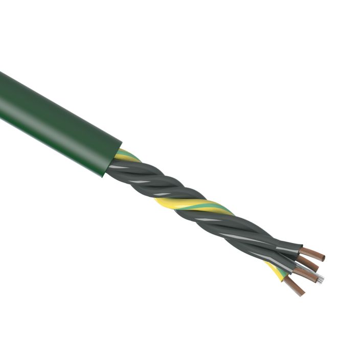 igus continuous flexing multi-conductor control cable, 4 conductors (includes ground), 2.50mm2 (14 AWG), PVC conductor insulation material, unshielded, PVC jacket, green, cut to length.