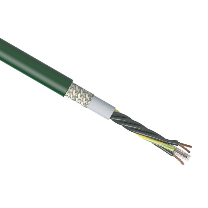 igus continuous flexing multi-conductor control cable, 5 conductors (includes ground), 0.50mm2 (20 AWG), TPE conductor insulation material, shielded, PVC jacket, green, cut to length.