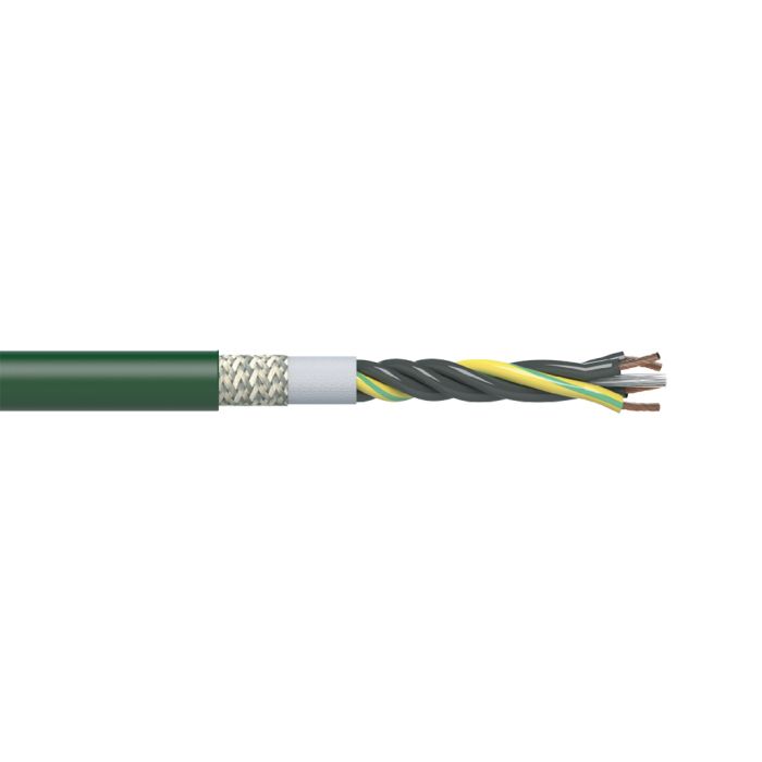 igus continuous flexing multi-conductor control cable, 4 conductors (includes ground), 1.50mm2 (16 AWG), PVC conductor insulation material, shielded, PVC jacket, green, 20ft coil.