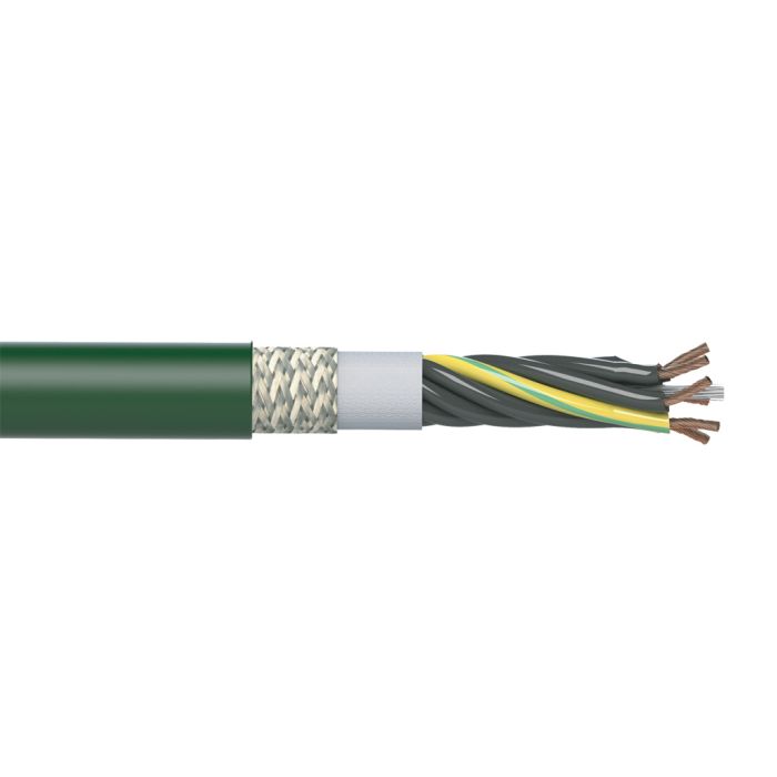 igus continuous flexing multi-conductor control cable, 7 conductors (includes ground), 1.50mm2 (16 AWG), PVC conductor insulation material, shielded, PVC jacket, green, 50ft coil.