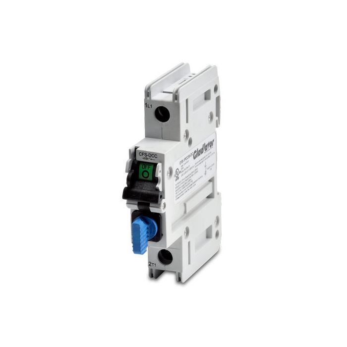 Gladiator CFS series disconnect switch, fusible, Class CC, load break capable, 1-pole, 80 VDC, 30A, 20kA SCCR, DIN rail mount, UL 98 rated.