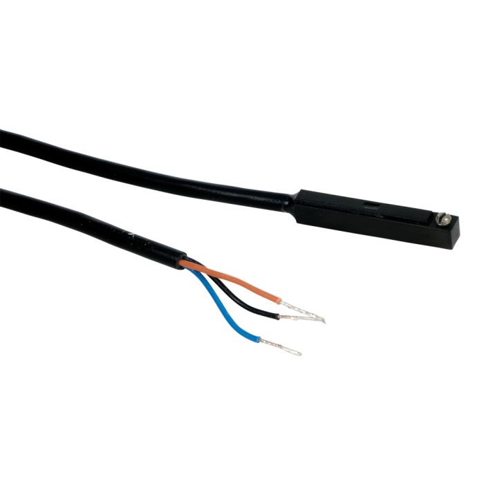 NITRA cylinder switch, square, PNP, N.O. output, 5-28 VDC operating voltage, LED indication, 9.8ft (3.00m) 3-wire pigtail with wire leads, 4mm square T-slot mount, for position sensing.