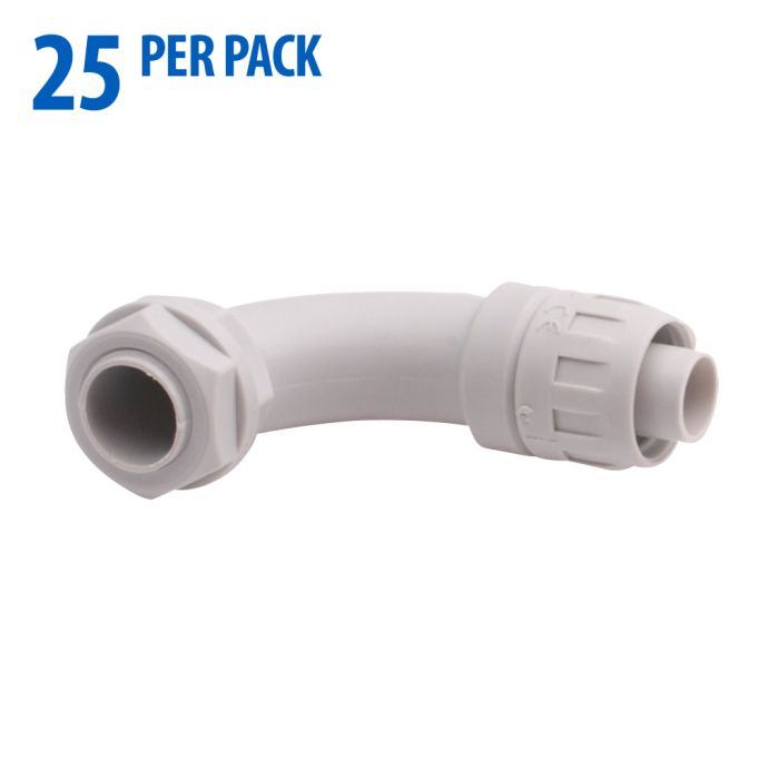 IBOCO connector, liquid-tight, for flexible tubing, 90-degree, non-metallic, gray, 3/8 inch. Seal gaskets included. Package of 25.