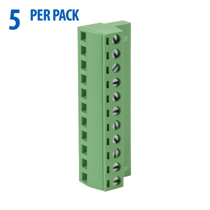 DINnector terminal plug, 11-pole, 22-14 AWG, green, 12A, 300V rated (UL), Top wire entry with terminal screw 90 degrees from entry, 5 pieces per package.