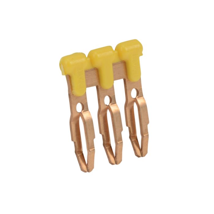 DINnector terminal block jumper, 3-pole, yellow, 25A, 600V rated (UL), screwless type, Cutting tool (DN-J4CUT) is recommended to cut jumper, 25 per package.