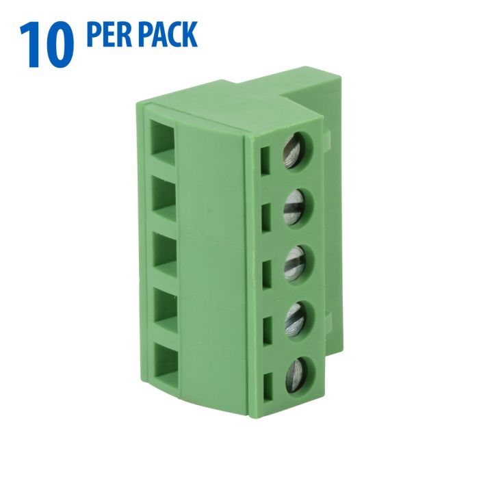 DINnector terminal plug, 5-pole, 22-14 AWG, green, 12A, 300V rated (UL), Top wire entry with terminal screw 90 degrees from entry, 10 pieces per package.